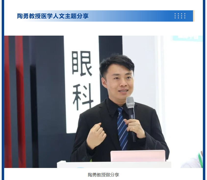 此次活动,特别邀请到了国内知名眼科专家陶勇教授做现场分享。作为医学人文的倡导者,他以 “医学有温度,人文暖人心” 为主题,深入浅出阐释 “治愈” 不仅是技术层面的祛病,更是心灵层面的慰藉,其深刻见解引发全场共鸣。陶勇教授的演讲,为活动注入浓厚的人文底色。