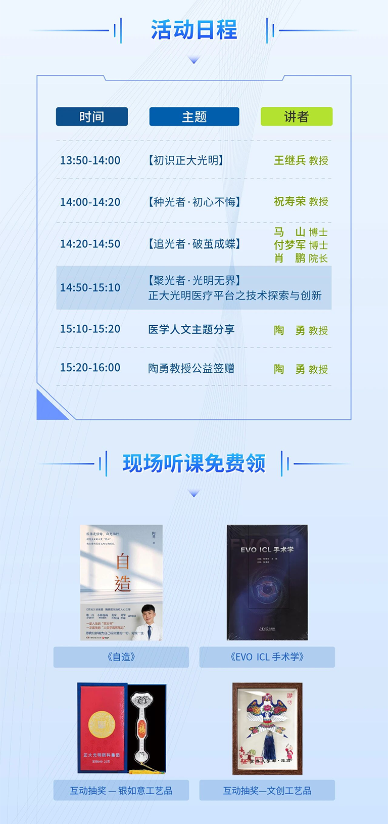 在学术盛宴之外,正大光明眼科集团展台(C120号)将惊艳亮相全国眼科年会,并于9月5日下午呈现专场路演活动。活动特别邀请国内知名专家陶勇教授进行主题学术交流会,并开展《自造》《EVO ICL手术学》赠书活动。现场更有互动抽奖等接连不断的惊喜等着您,期待您的参与~